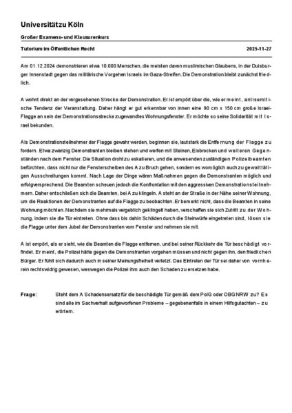 Genau, in der Lösung zu OER011 wurde meine ich folgender Aufbau gewählt: Ermessensnichtgebrauch – Ermessensfehlgebrauch (hier: Nichtberücksichtigung der Grundrechte anhand der Prüfung des Schutzbereichs und Eingriffs) – Ermessensüberschreitung (hier: Rechtfertigung des Eingriffs im Rahmen einer Verhältnismäßigkeitsprüfung). In einem anderen Fall (der Bayern-Baurecht-Reihe auf LSL), der auch auf das Bauordnungsrecht als spezielles Sicherheitsrecht konzentriert war, war der Aufbau dann wiederum: Entschließungsermessen – Auswahlermessen (hier: Störer und Mittel). Für mich jedenfalls war die unterschiedliche Ermessensprüfung in den Lösungen nicht wirklich nachvollziehbar.